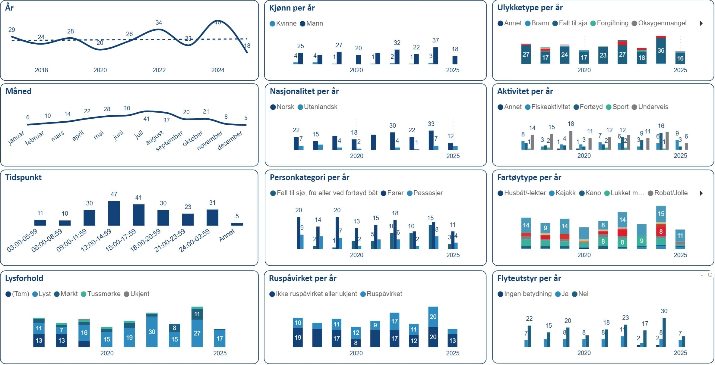 I perioden fra 2017 til 2023 har antall dødsulykker med fritidsbåter ligget relativt stabilt, vanligvis mellom 20 og 30 omkomne per år. Dette viser at risikoen med å ferdes på sjøen over tid har vært vedvarende høyt, til tross for økt fokus på sikkerhet, opplæring og regelverk.