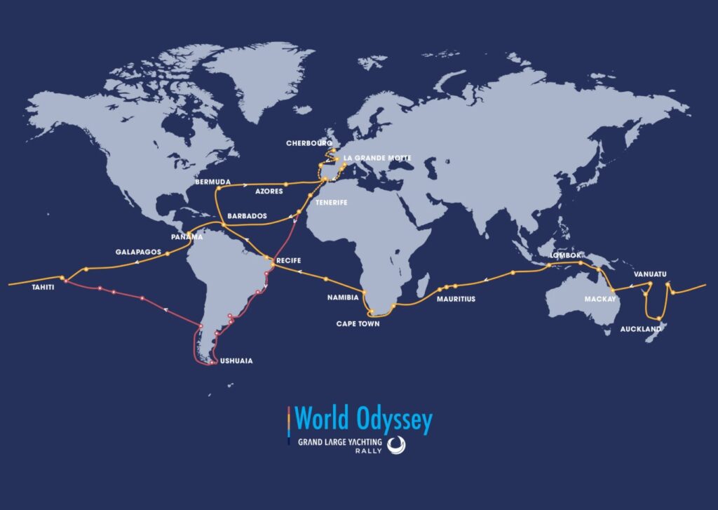Mange GLYWO‑deltakere følger en klassisk jordomseilingsrute. Seilasen starter gjerne på Kanariøyene før Atlanterhavet krysses mot Karibia. Derfra går ferden videre gjennom Panama‑kanalen og ut i Stillehavet, med stopp i ikoniske langturseilingsområder som Fransk Polynesia, Tonga og Fiji. Turen fortsetter ofte via Australia eller New Zealand, før man krysser Det indiske hav mot Sør‑Afrika og deretter setter kursen tilbake mot Europa.
