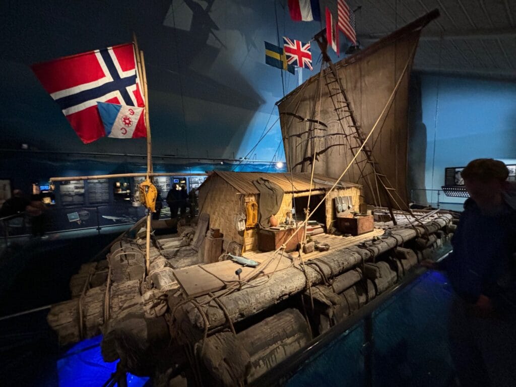 Kon-Tiki med kreativ flaggføring. Alle i mannskapet hadde hvert sitt flagg – Foto: Seilfolk.no